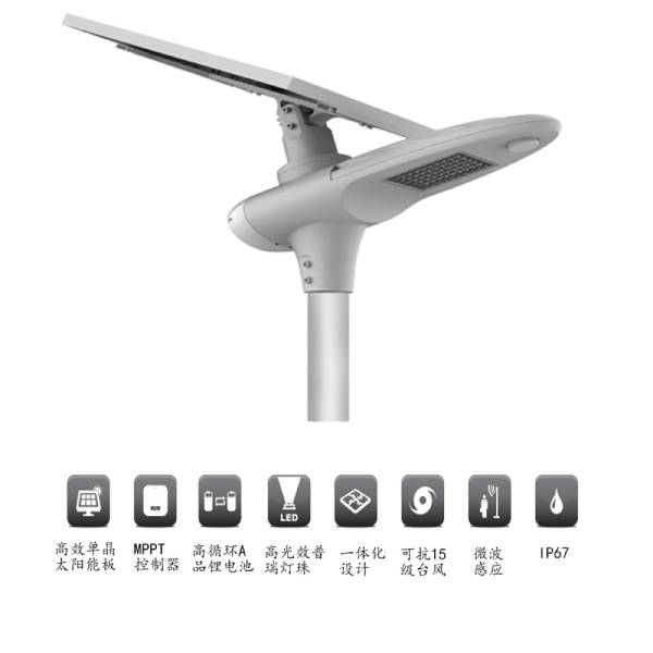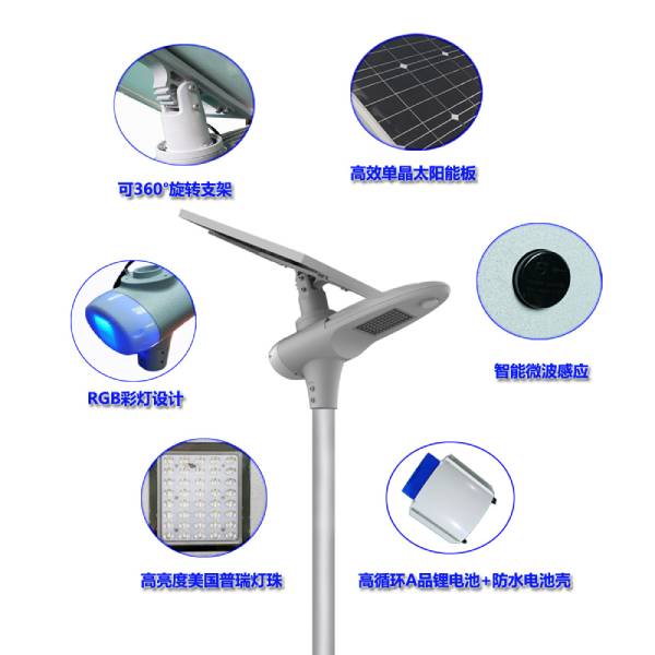弟二代一體化太陽能路燈采用高效單晶光伏板,智能MPPT控制器,長壽命鋰電池,高光效燈珠,集于一體化設(shè)計,安裝使用方便,并擁有微波感應(yīng)和RGB彩燈設(shè)計,實現(xiàn)多功能亮燈