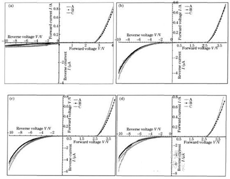 表1為三種樣品老化前、老化80,150和200h的Vf和Ir值,老化條件為常溫900mA,其中Vf為350mA下的電壓值,Ir為反向 10V下的漏電流值,通常反向漏電流Ir在反向5V下測量,為比較結(jié)果,選擇更苛刻的條件,在反向10V下測量。圖1是三種樣品老化前、老化80,150 和200h后的I-V特性曲線,分別為圖1(a)~(d)。圖1(a)顯示了A,B,C三種樣品在老化前都有較好的I-V特性,其開啟電壓在2.5V左 右,反向10V下電流都在10-9A數(shù)量級。老化200h后三種樣品在反向10V下其漏電流Ir都比老化前明顯增加。表1說明了經(jīng)大電流200h老化后相 同反壓(-10V)下B樣品的漏電流最小,A樣品次之,C樣品最大,而且隨著老化時間的推移,三種樣品在相同反壓下的漏電流差別越來越大。 InGaNMQWLED在老化后正向電壓稍有升高,是因為大電流長時間老化使得裸露的n電極(鋁)局部氧化從而導致接觸電阻變大造成。老化后漏電變大的原 因為:InGaNLEDpn結(jié)耗盡層的寬度主要由p型層載流子濃度決定,芯片經(jīng)過大電流長時間老化后,由于Mg-H復合體的分解,受主Mg被重激活,使得 p型載流子濃度升高,導致耗盡層變窄,反向偏置時勢壘區(qū)變薄,隧道擊穿成分增多,反向電流增加;另外,芯片經(jīng)過大電流長時間老化后,量子阱區(qū)缺陷密度增 加,反向偏置時有缺陷和陷阱輔助隧穿引起漏電流,B,A,C三種樣品熱導率依次降低,所以在老化時產(chǎn)生的缺陷和陷阱密度依次降低,因此在相同反壓下三種樣 品漏電流依次增大(如表1和圖1所示)。